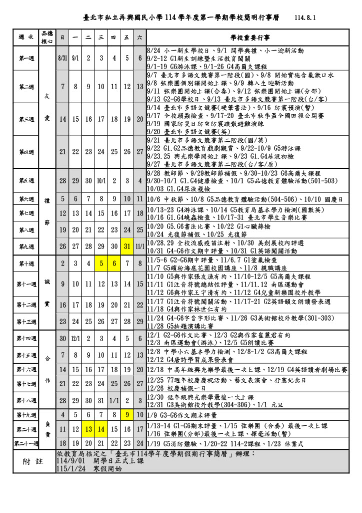 再興小學114學年上學期行事曆
