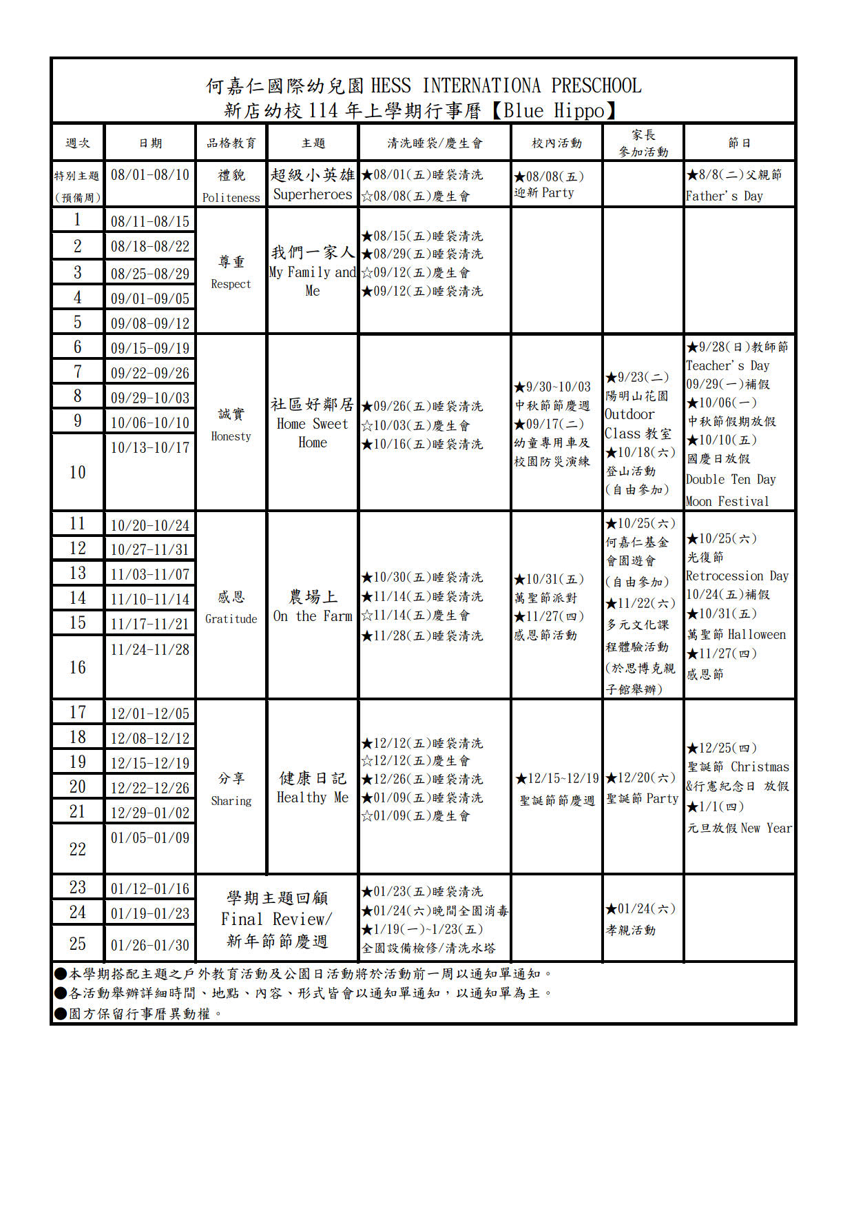 何嘉仁幼兒園114學年上行事曆
