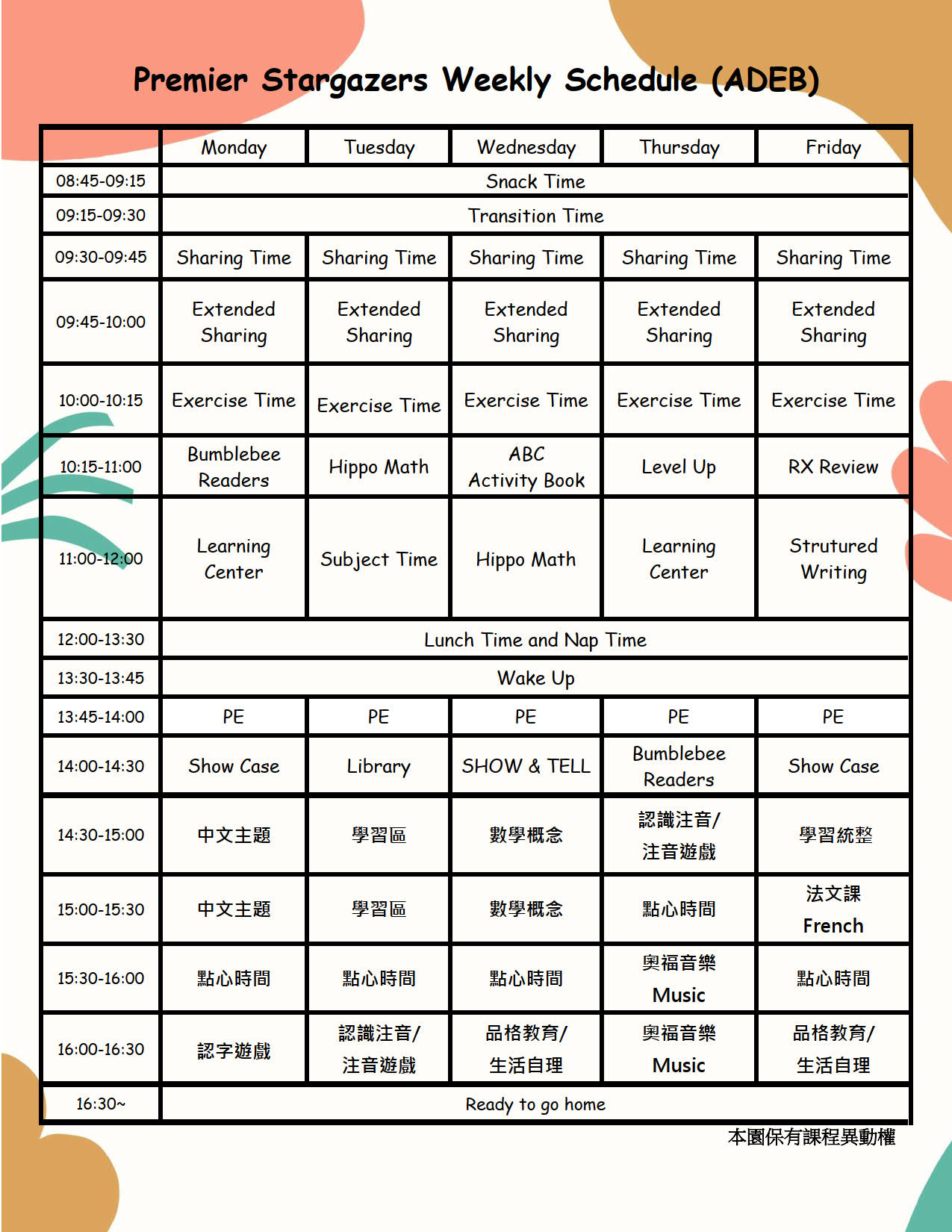 何嘉仁幼兒園ADEB小班課程表