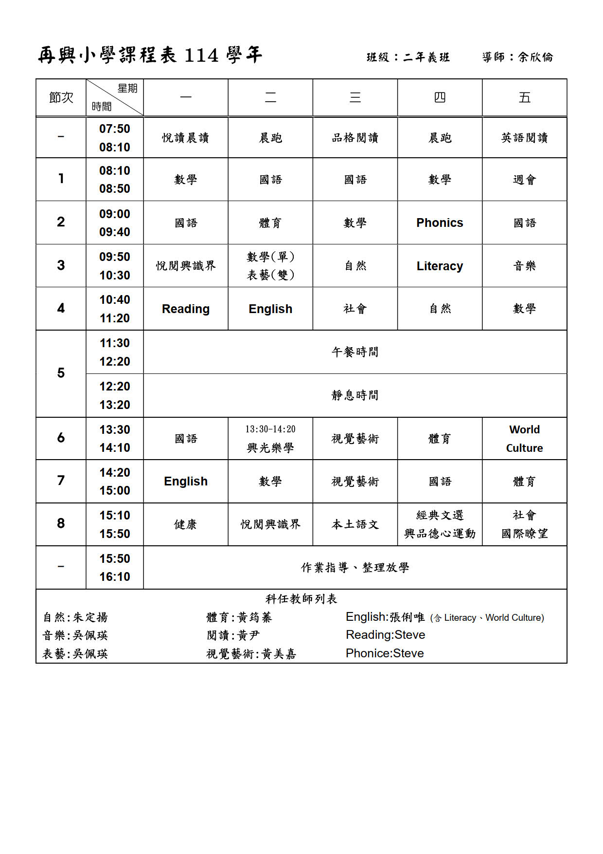 二年義班課程表