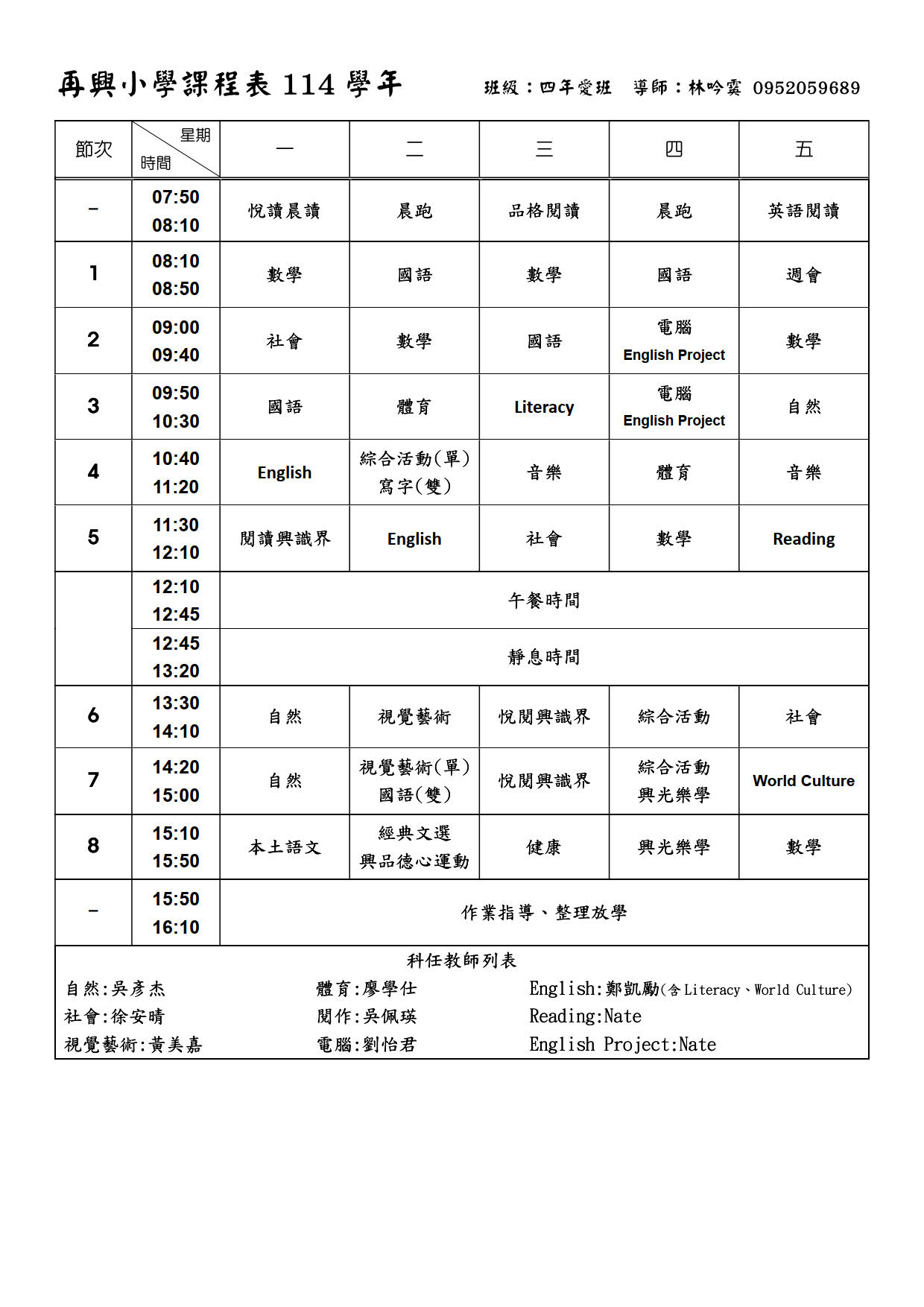 再興小學四年愛班課程表
